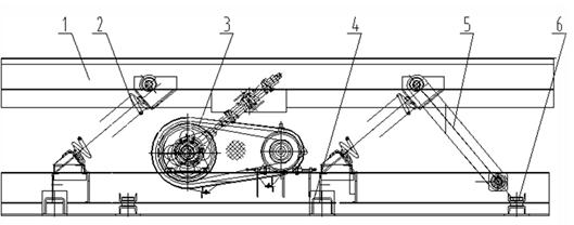 1輸送槽、2主振彈簧、3驅(qū)動(dòng)連桿機(jī)構(gòu)、4底座、5導(dǎo)向桿、6輔助支座。