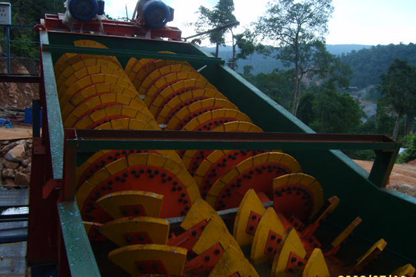 - 清洗:砂石從給料箱進入沉淀池,在轉動著的螺旋葉片作用下,使砂石翻滾并相互研磨,除去覆蓋砂石表面上的雜質,同時破壞包復砂粒的水汽層,以利于脫水。由多孔板進行的清洗水形成上升水流,將比重小的異物帶到水面溢出堰外,完成清洗作用。